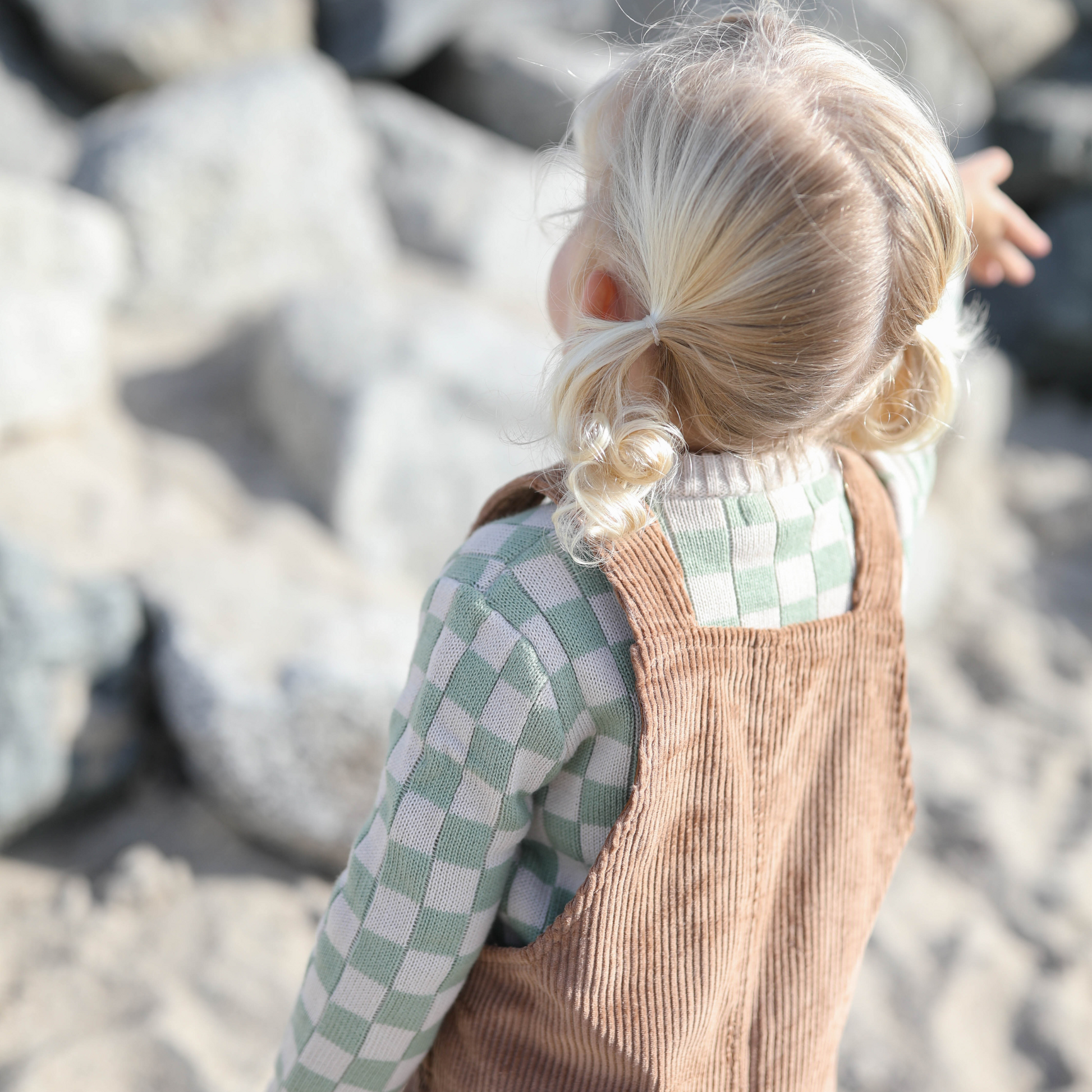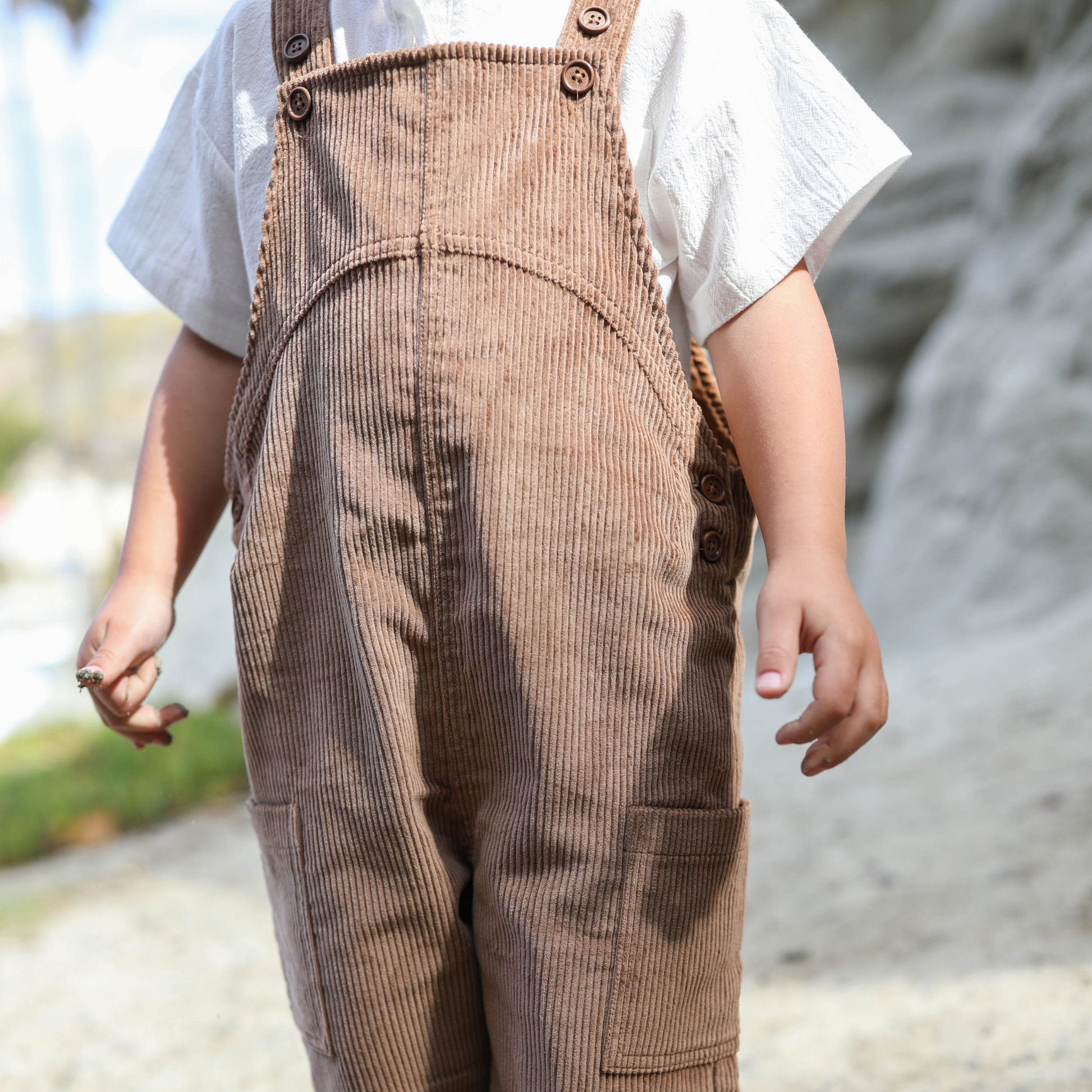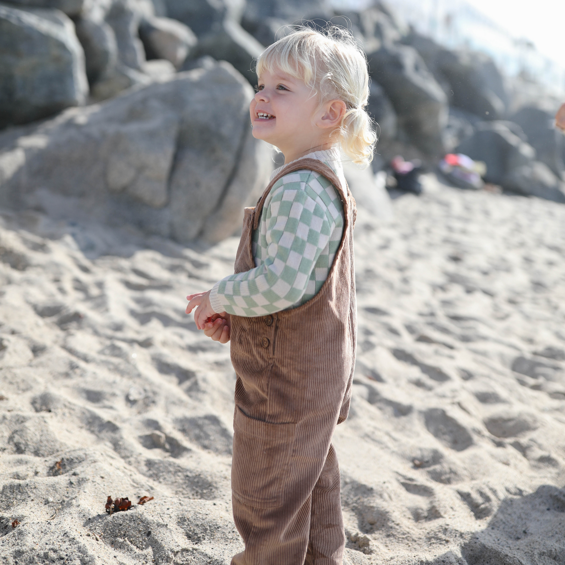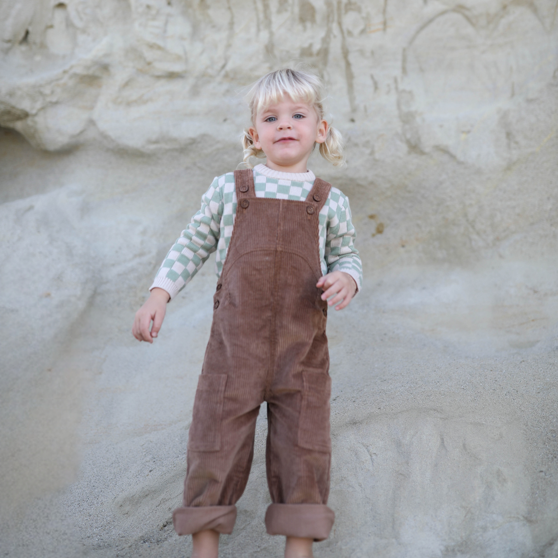 We brought back our best selling corduroy overalls in a NEW rich brown that matches perfectly with our checkered sweaters! These overalls are high quality and 100% cotton. The shoulder straps have two buttons to give room for growing little ones. Great for all your play day adventures!