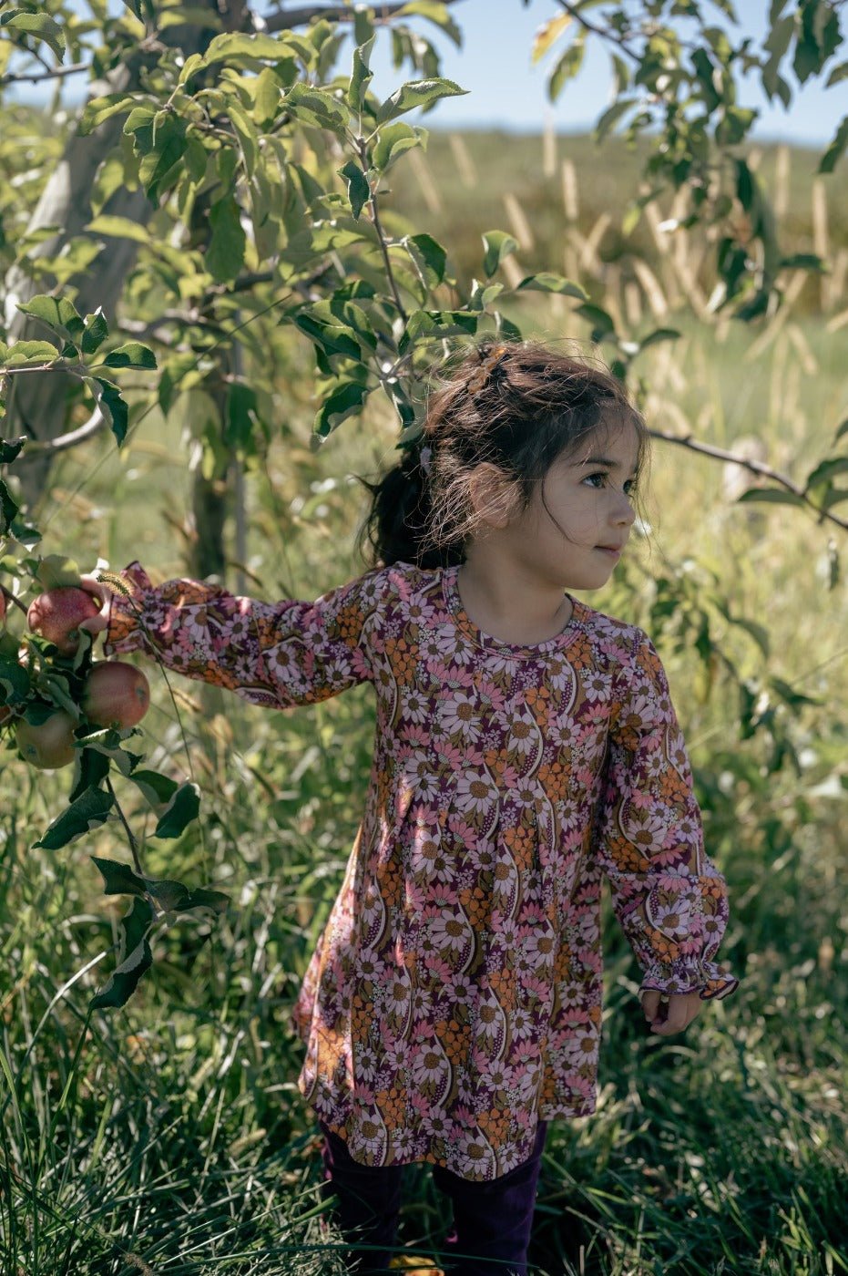 Your little girl will go for this picture perfect groovy dress over and over this fall season. This girl's dress features a beautiful vintage-inspired print in bold fall colors, a sweet seam detail on the front, and elastic at the wrists for a cute sleeve detail. We take nostalgic silhouettes and prints and bring them into modern times with our comfortable fabric. Pair this pretty dress with cozy tights and boots to complete the perfect outfit.