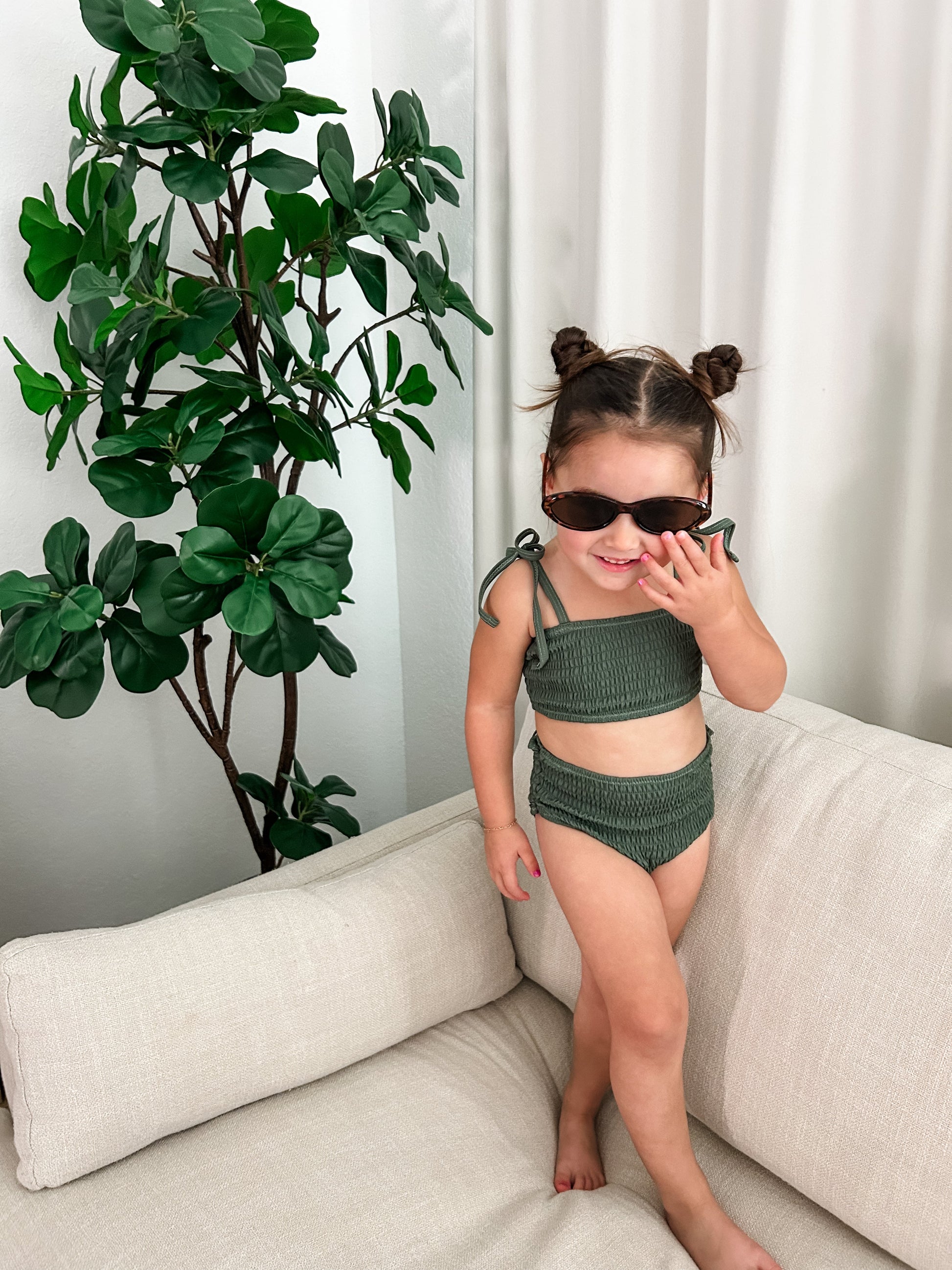 Get ready to make a splash this summer with our adorable Girls Black Smocked Bikini! This sweet swimsuit is designed with comfort and style in mind, featuring adjustable tie straps that ensure a perfect fit for your little one.
