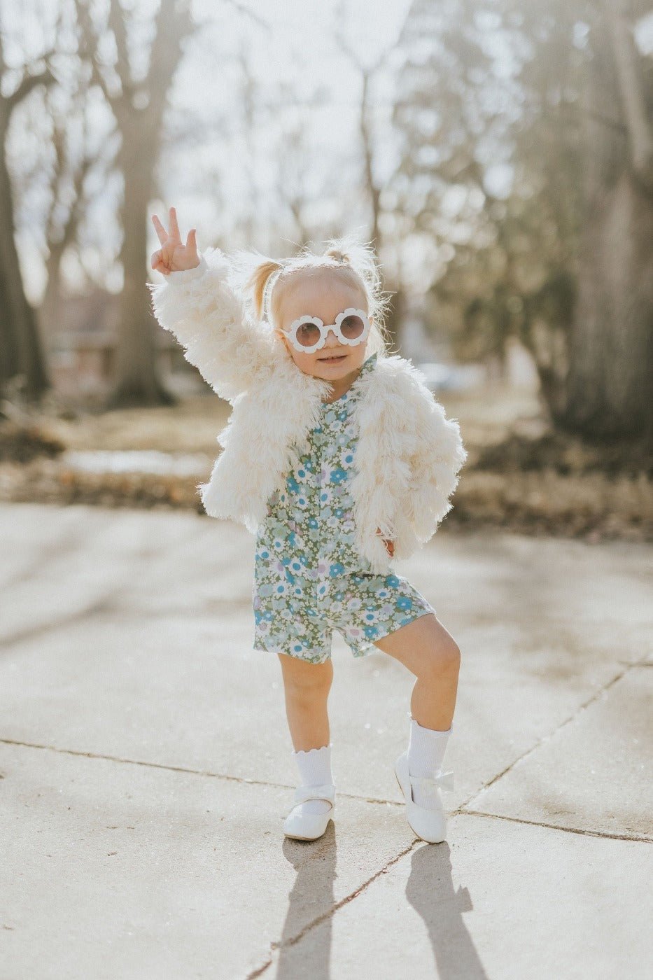 Your little one will be the grooviest girl in this flower power romper made from a comfy and breathable double gauze cotton fabric. Inspired by an iconic flower power print from the 60s, this groovy outfit will be sure to be their favorite. Made with convenient snaps at the crotch and back neck to make getting on and off easy. It also features decorative bows at the corners and the cutest little pockets so they can collect treasures.