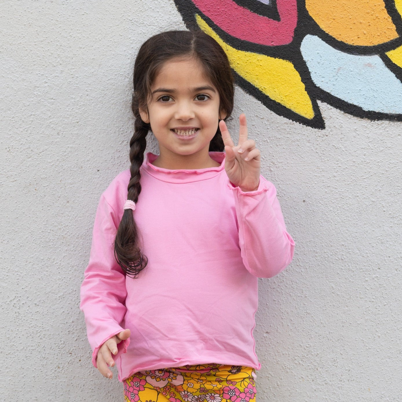 Pair these solid color tops with their favorite groovy bell bottoms. Made from the same soft and stretchy cotton-spandex blend fabric as our main collection, this top completes any outfit. Wear it on it's own or layered with a vest or cardigan. Ruffle hems and a faux turtleneck for a little extra flare.