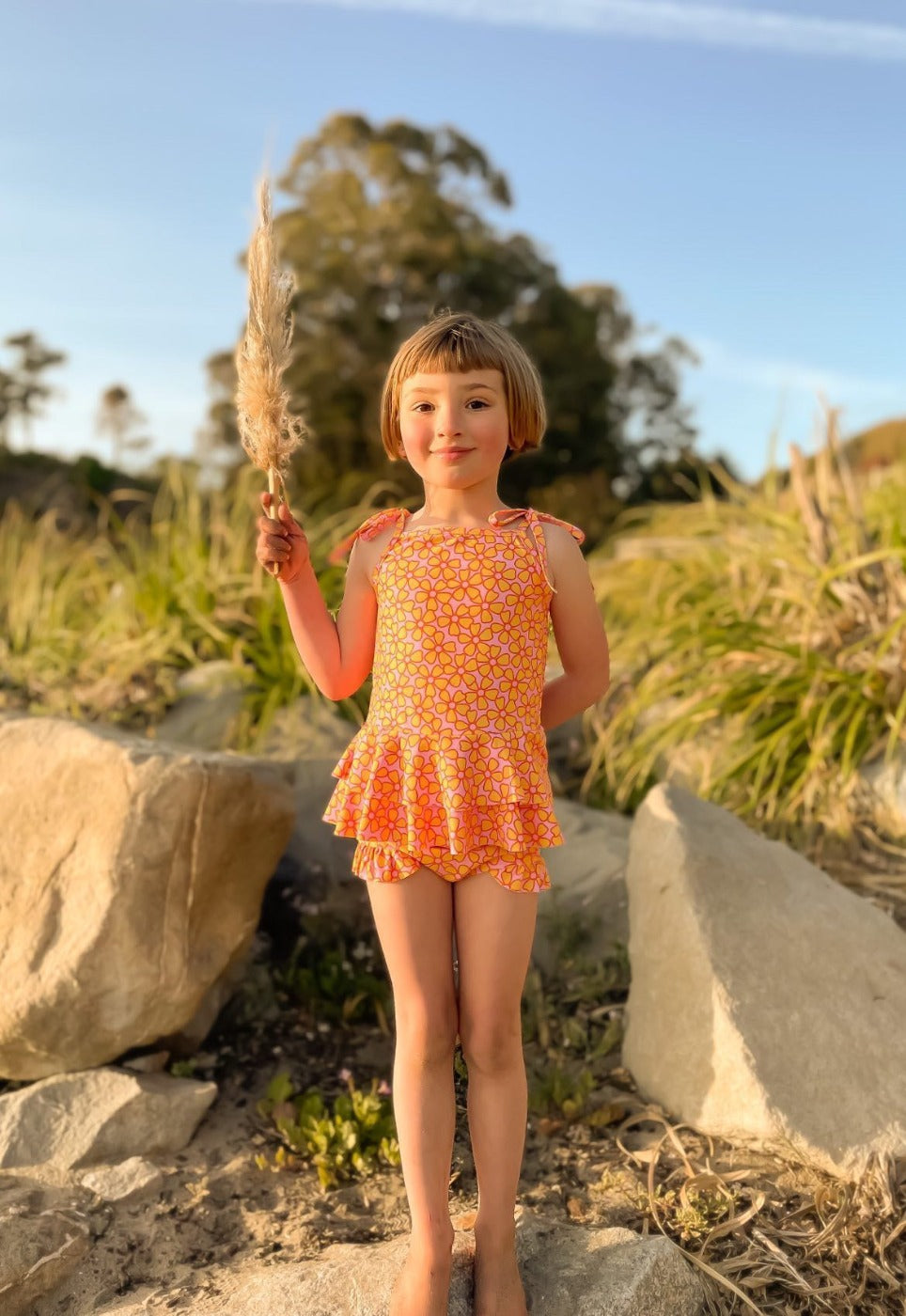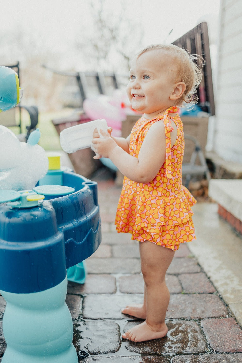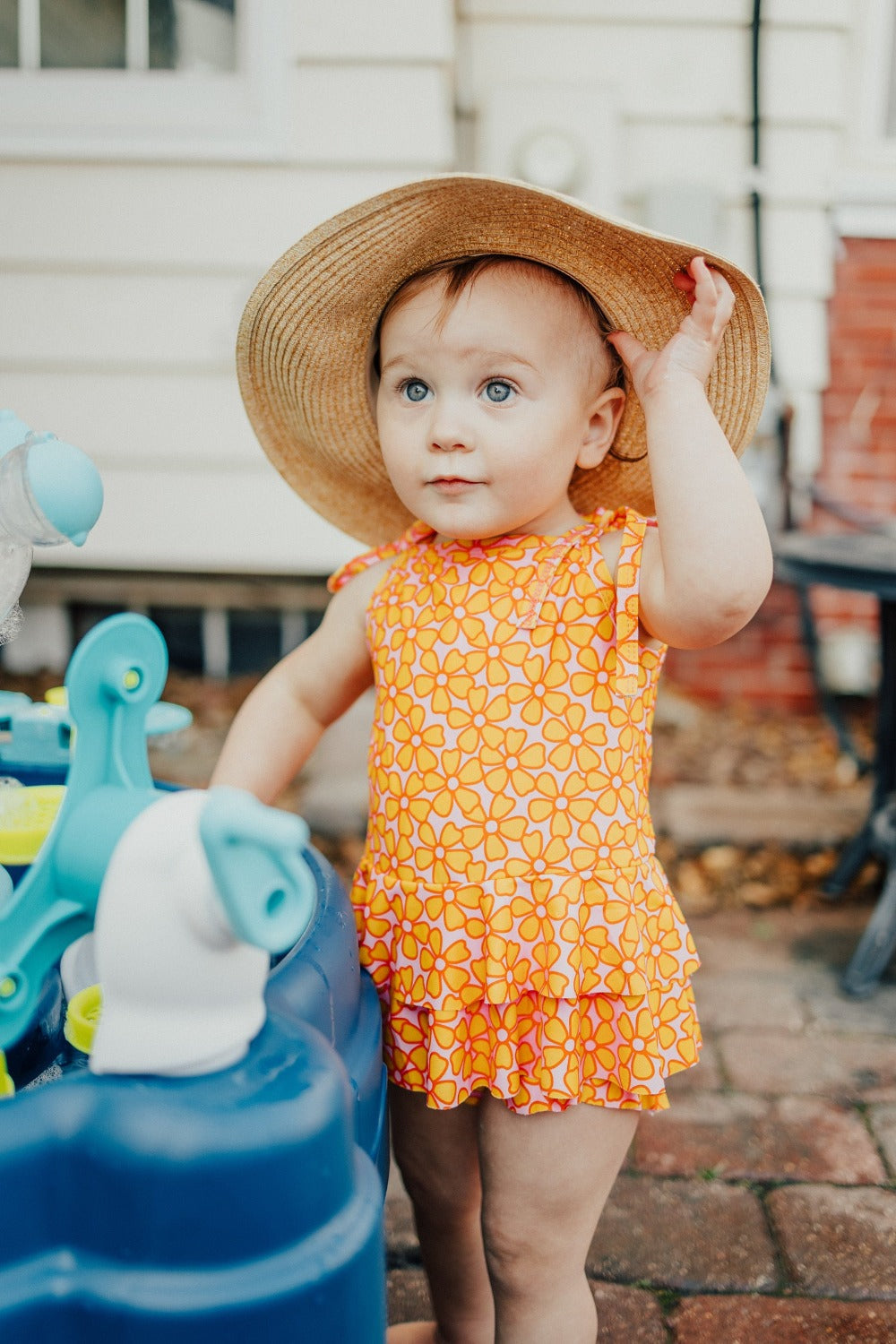 So fun with all these ruffles, this two piece swimsuit will look absolutely adorable on your little one. It features tie shoulder closures so you can adjust the fit, and lots of fun ruffles. The bright groovy print will look adorable out on a hut sunny day.