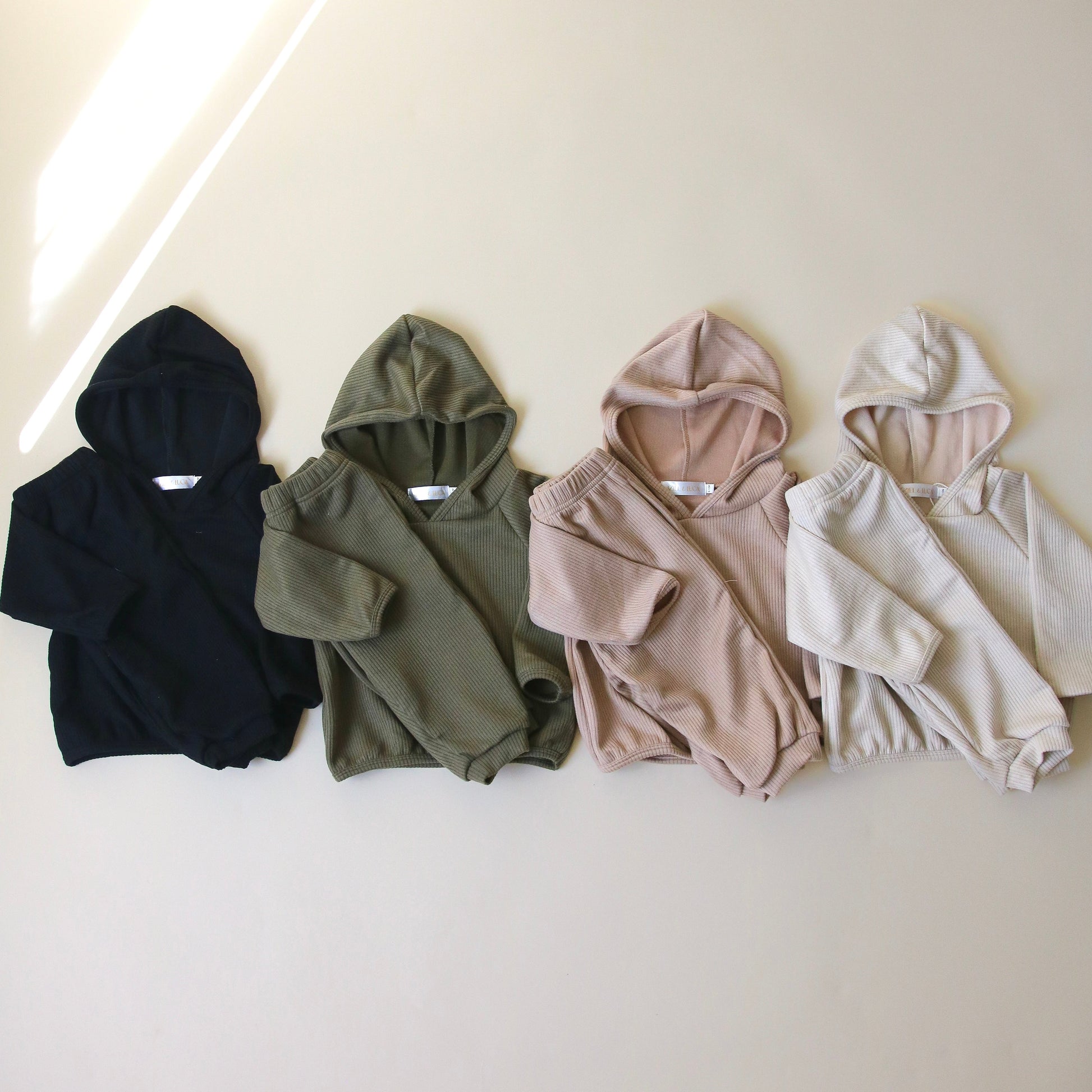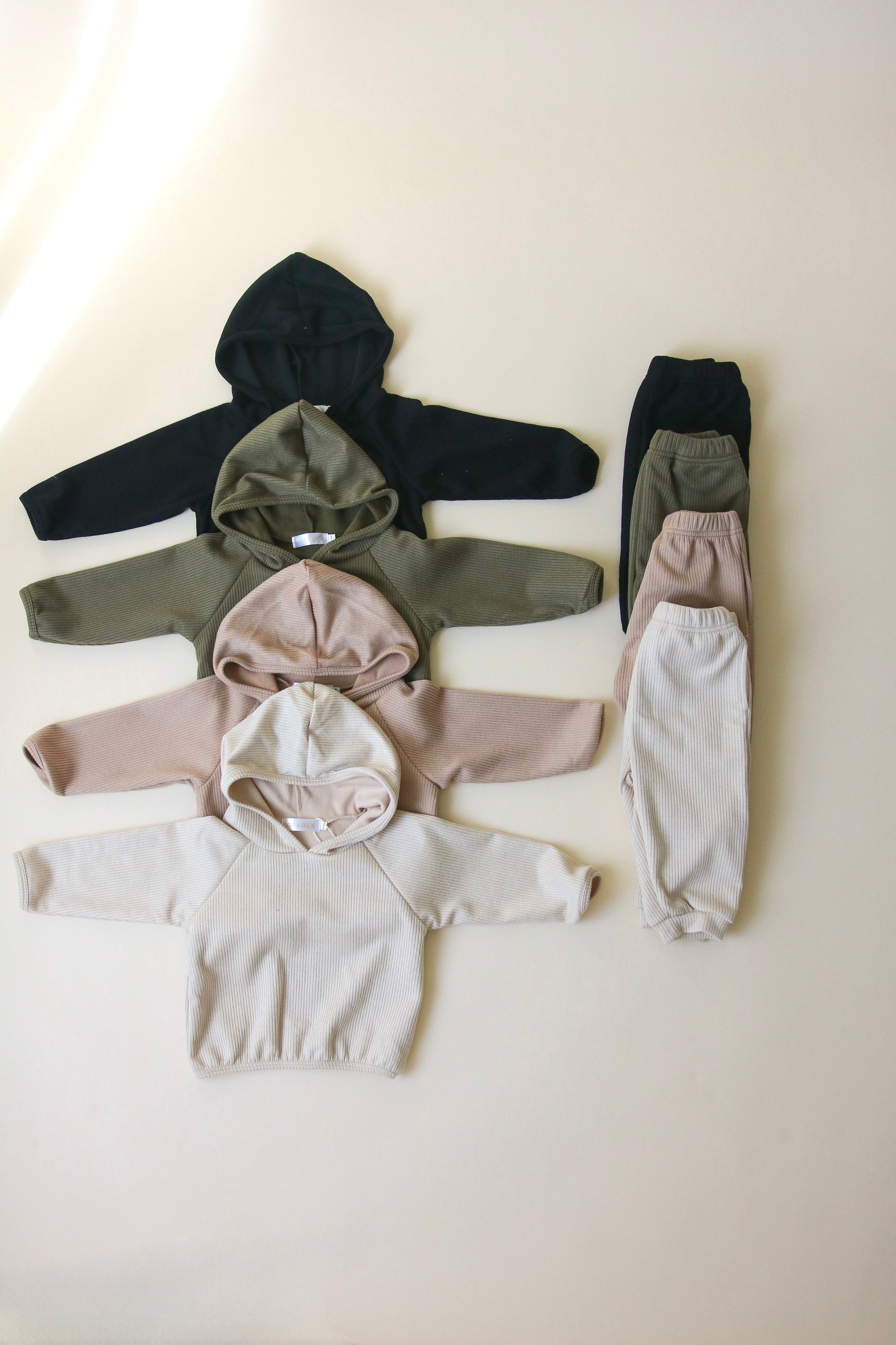 Introducing our Ribbed Hoodie Sweat Set, crafted from a luxurious lightweight, soft, and breathable fabric. This set is designed to keep your baby cozy and stylish all day long, whether they're lounging at home or out for a stroll in the park.