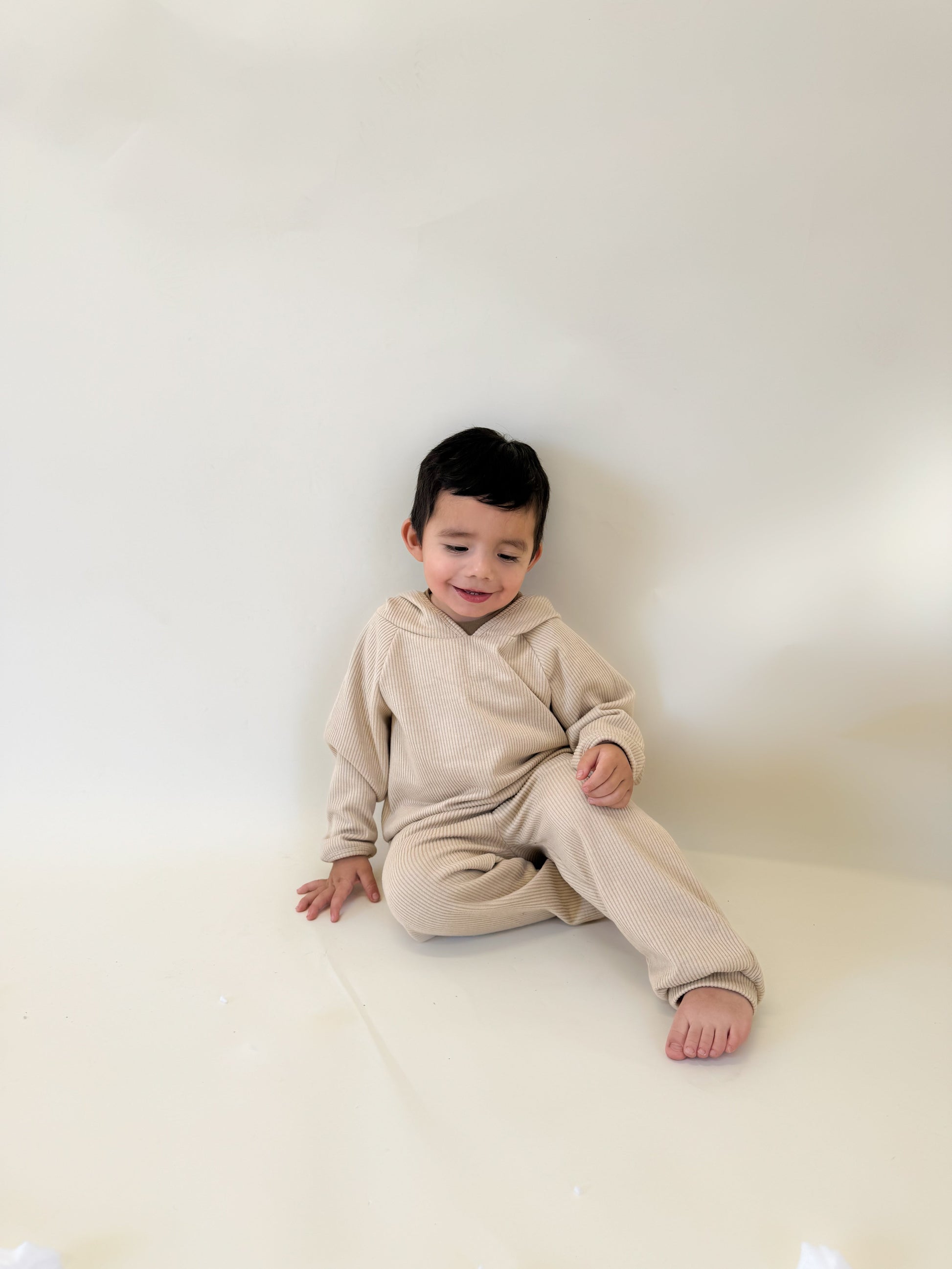 Our Ribbed Hoodie Sweat Set features a cozy hoodie with a ribbed texture, providing extra warmth and comfort for your little one. The matching sweatpants complete the ensemble, offering a relaxed fit that allows for easy movement and play.