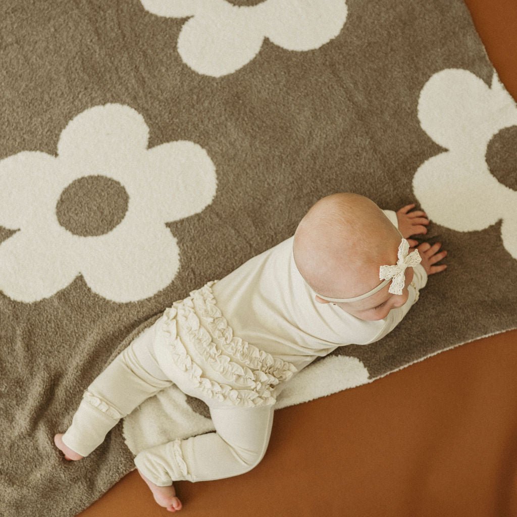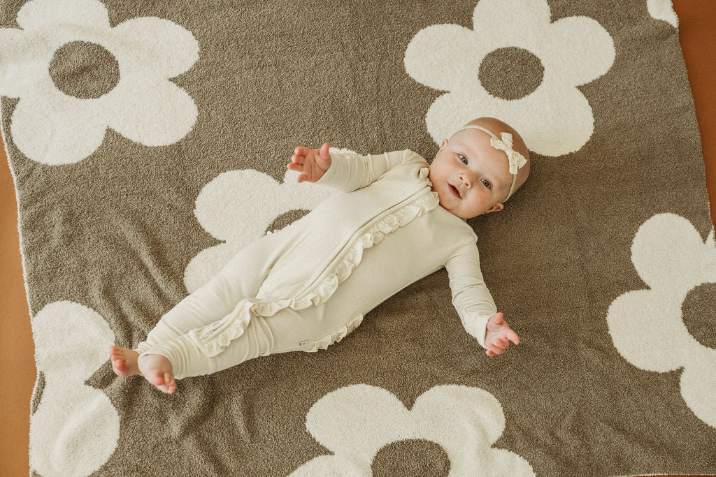 The neutral cream color pairs beautifully with any accessory or blanket, while the adorable ruffle detail adds a sweet, timeless touch. Designed for both comfort and convenience, it features a 2-way zipper that runs from neck to ankle—making diaper changes quick and easy, even while baby sleeps.