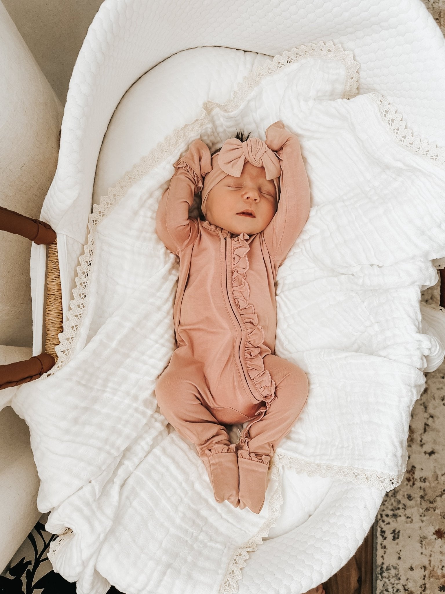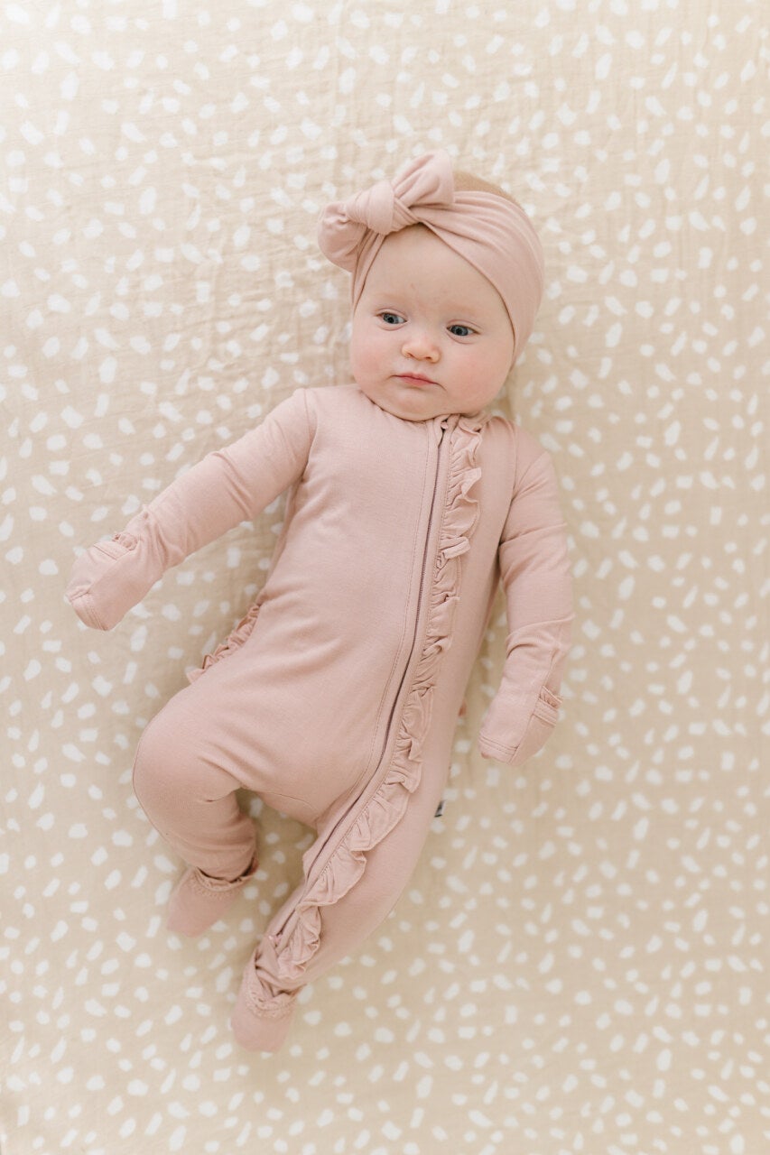 This dusty pink bamboo ruffle outfit makes the perfect going home outfit or gift. Made from naturally soft and lightweight bamboo viscose material to keep your baby comfortable. A one-piece outfit that features a 2 way zipper that runs from the neck to the ankle making those diaper changes super easy! Fold over cuffs to keep baby from scratching and to keep their little hands warm.