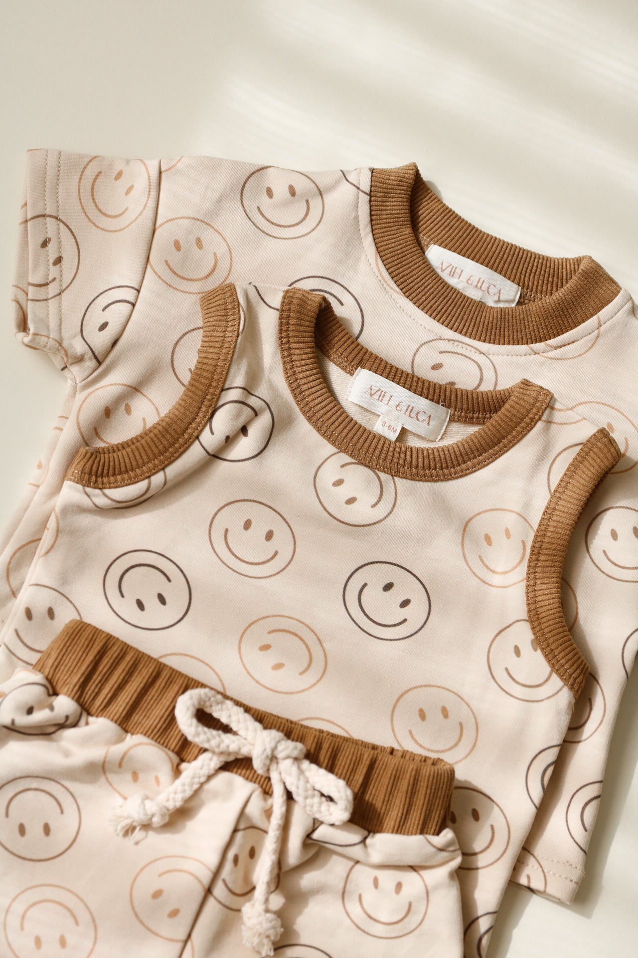 The focal point of this set is the T-shirt, adorned with a charming smiley face print that adds a touch of whimsy to your look. With its classic crew neckline and short sleeves, this tee offers a relaxed fit that's perfect for laid-back summer days.