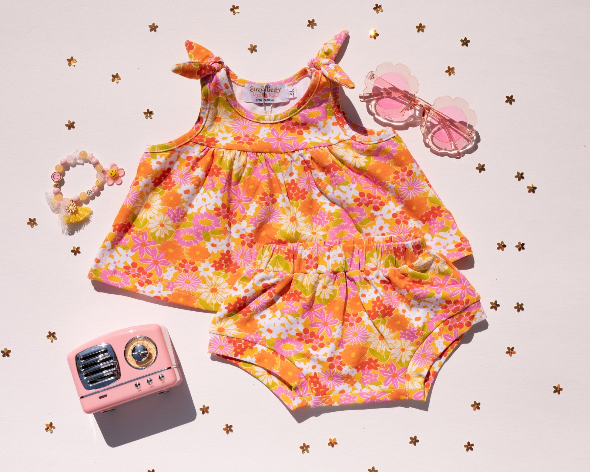 Fill her closet with a burst of bright flower power vibes with this groovy vintage vibes two piece set. This bright and cheery print will compliment her equally bright personality. She'll be comfy and cool all day in this cotton spandex outfit. Faux ties at the shoulder, just pull this on for an easy summer outfit.