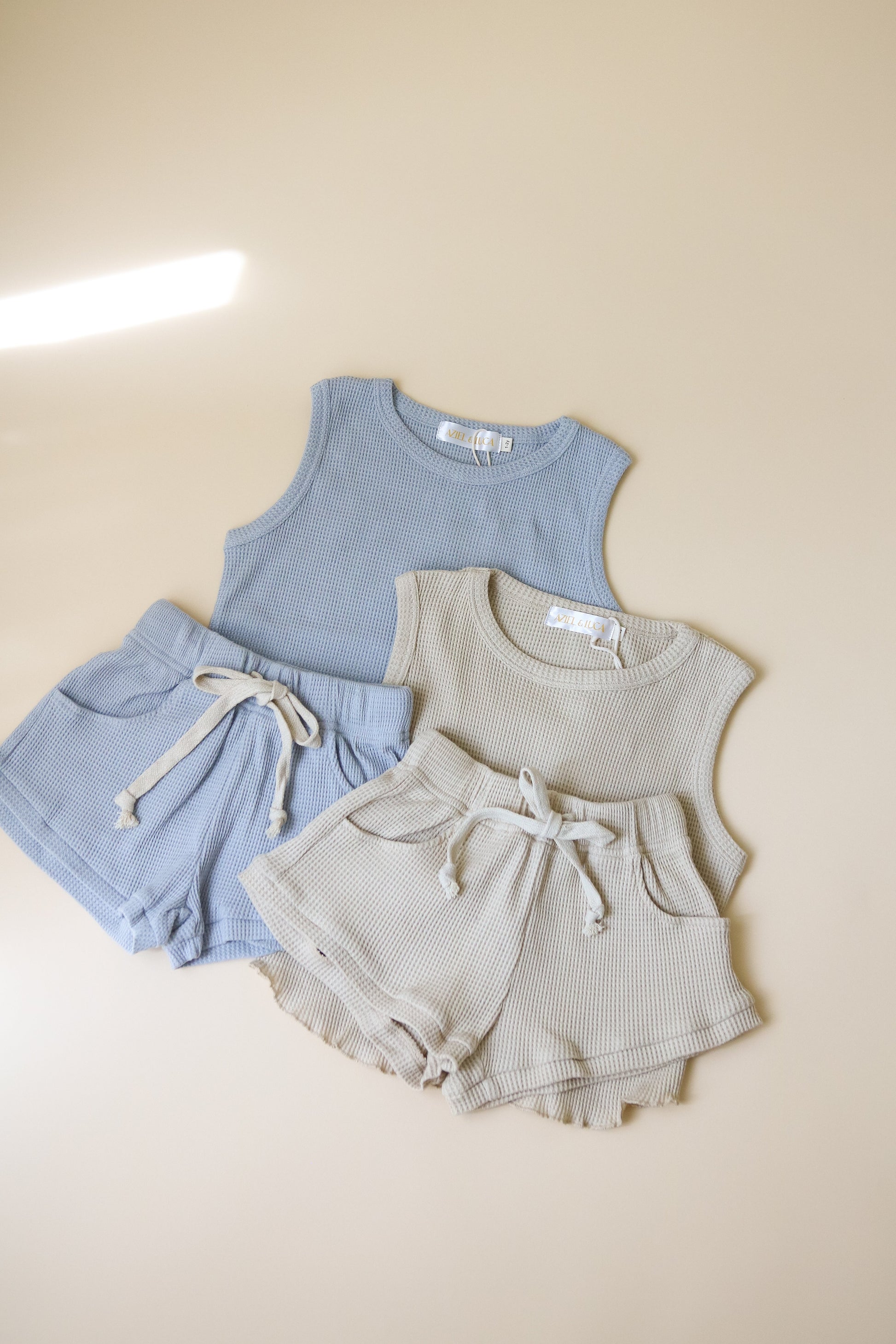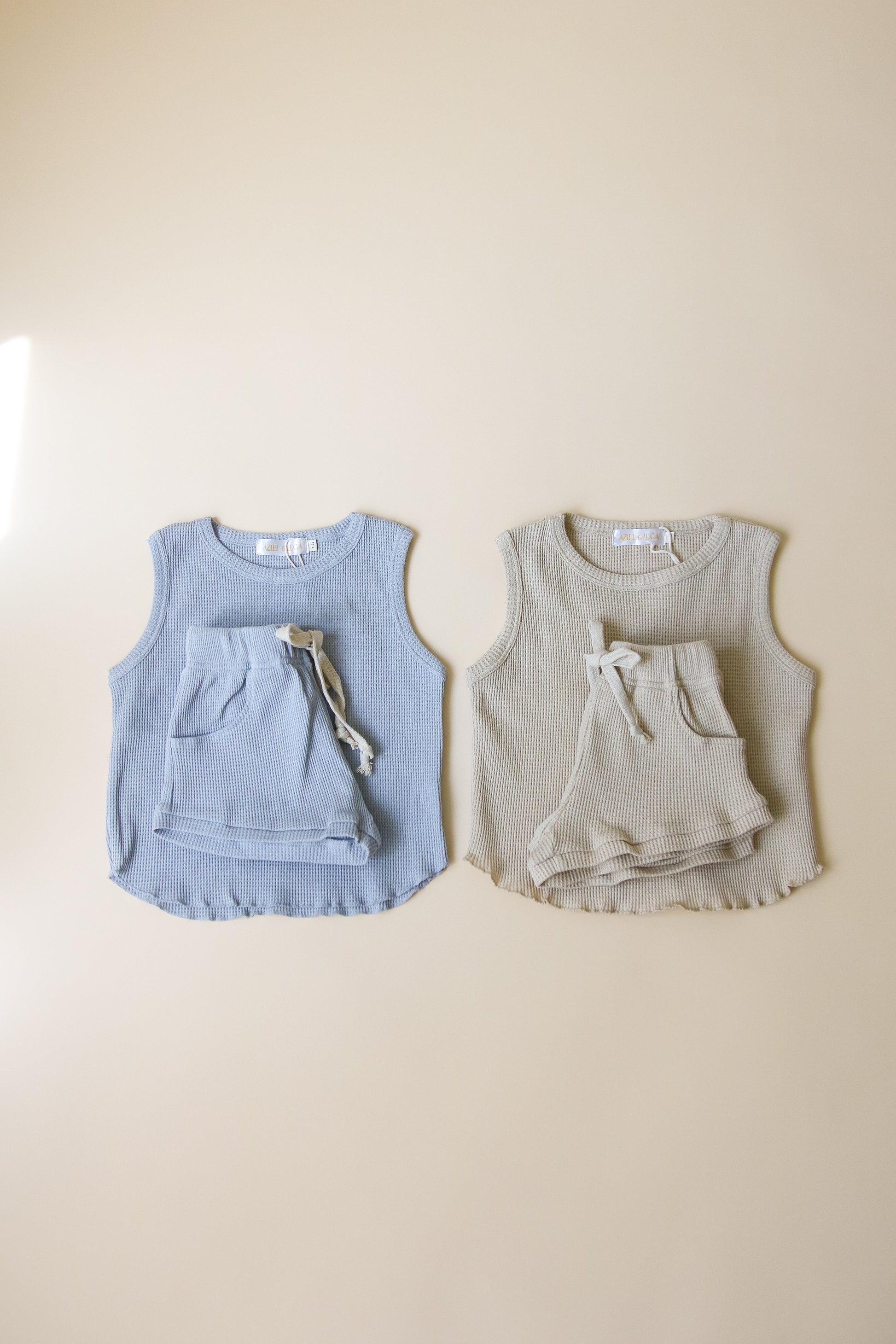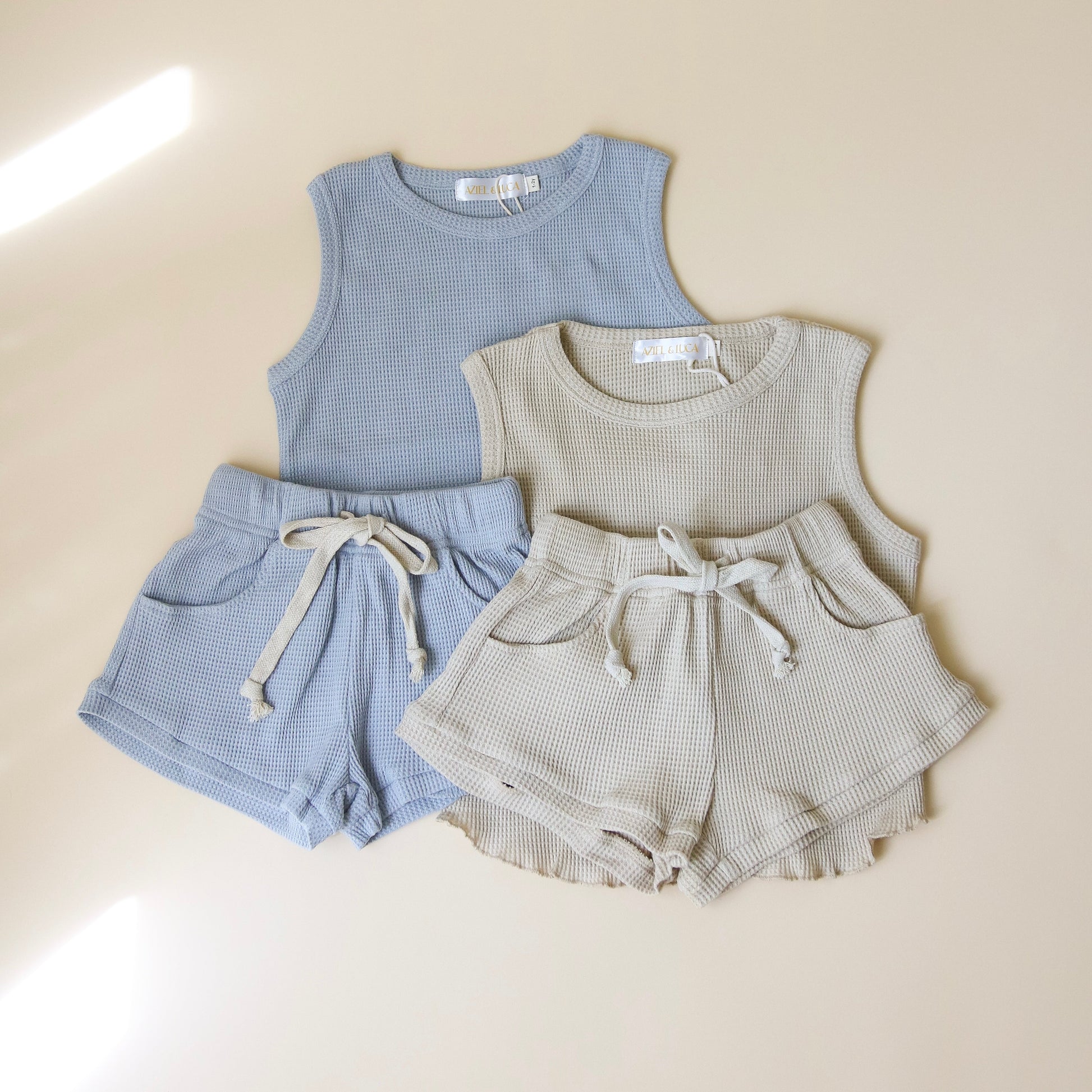 Elevate your little one's summer wardrobe with our Waffle Muscle Shorts Set. Made from 100% cotton waffle material, this set is designed to provide maximum comfort and breathability, ensuring your child stays cool and happy during warm weather adventures.